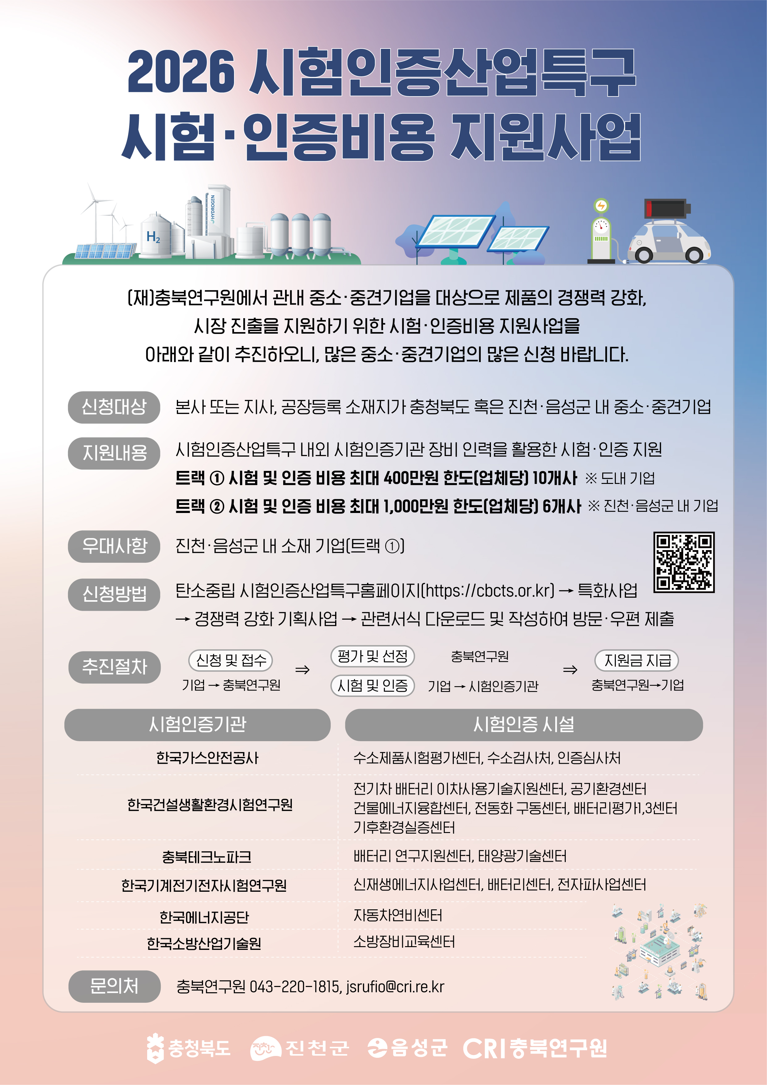 (유관기관 소식) 2026 시험인증산업특구 시험·인증비용 지원사업 공고