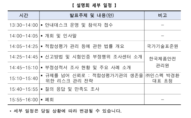 ㅇ 행사명 : 시험인증 부정행위 신고제도 설명회 (서울) ㅇ 대 상 : 연구기관 및 공인기관 등 적합성평가 관련 종사자 모두 ㅇ 신청안내 1) 신청방법: 온라인 폼 작성 제출 - 온라인 폼 링크: https://naver.me/GEdqgGLz * 참석 신청은 선착순으로 진행되며, 온라인 폼 설문이 접수되면 신청이 완료된 것이며 별도의 개별 회신은 드리지 않습니다. 2) 신청문의: 070-5223-1444, tacci@kips.kr ※설명회 참석은 KOLAS 인정 관련 필수 참석교육과 무관함 알려드립니다.